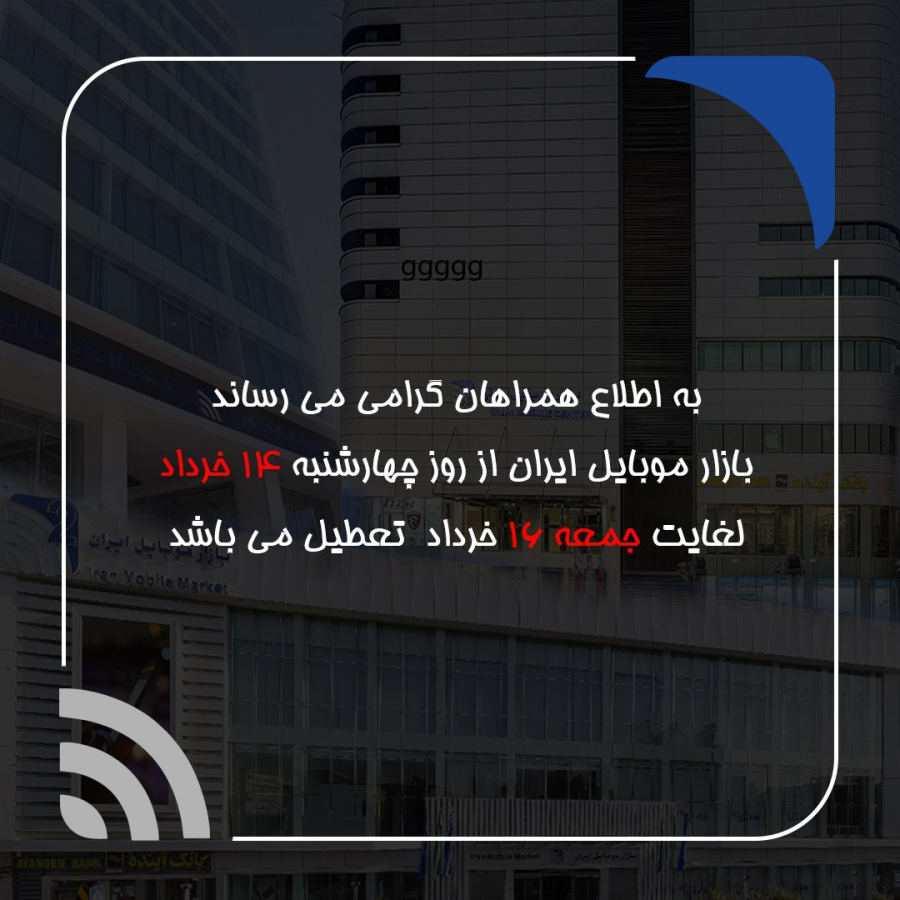 ضمن عرض تسلیت به مناسبت سالگرد ارتحال حضرت امام خمینی بدین وسیله به اطلاع میرساند مجموعه بازار های موبایل ایران در روزهای 14 و 15 و 16 خرداد ماه تعطیل می باشند .