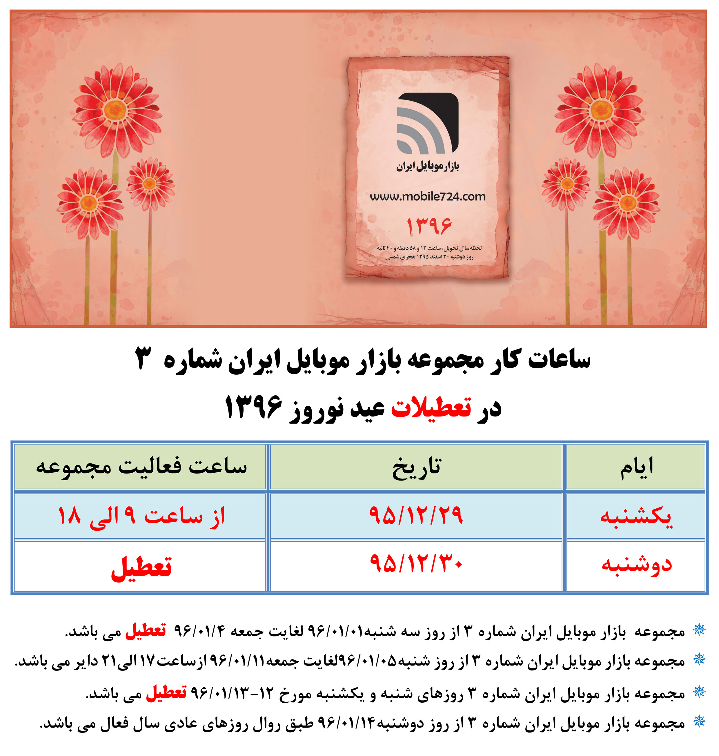 ساعت کار مجموعه بازار موبایل ایران شماره 3 در ایام نوروز 1396 دوشنبه, 25 آذر 1404 برای حمایت از محتوایی که میپسندید، به اشتراک بگذارید: