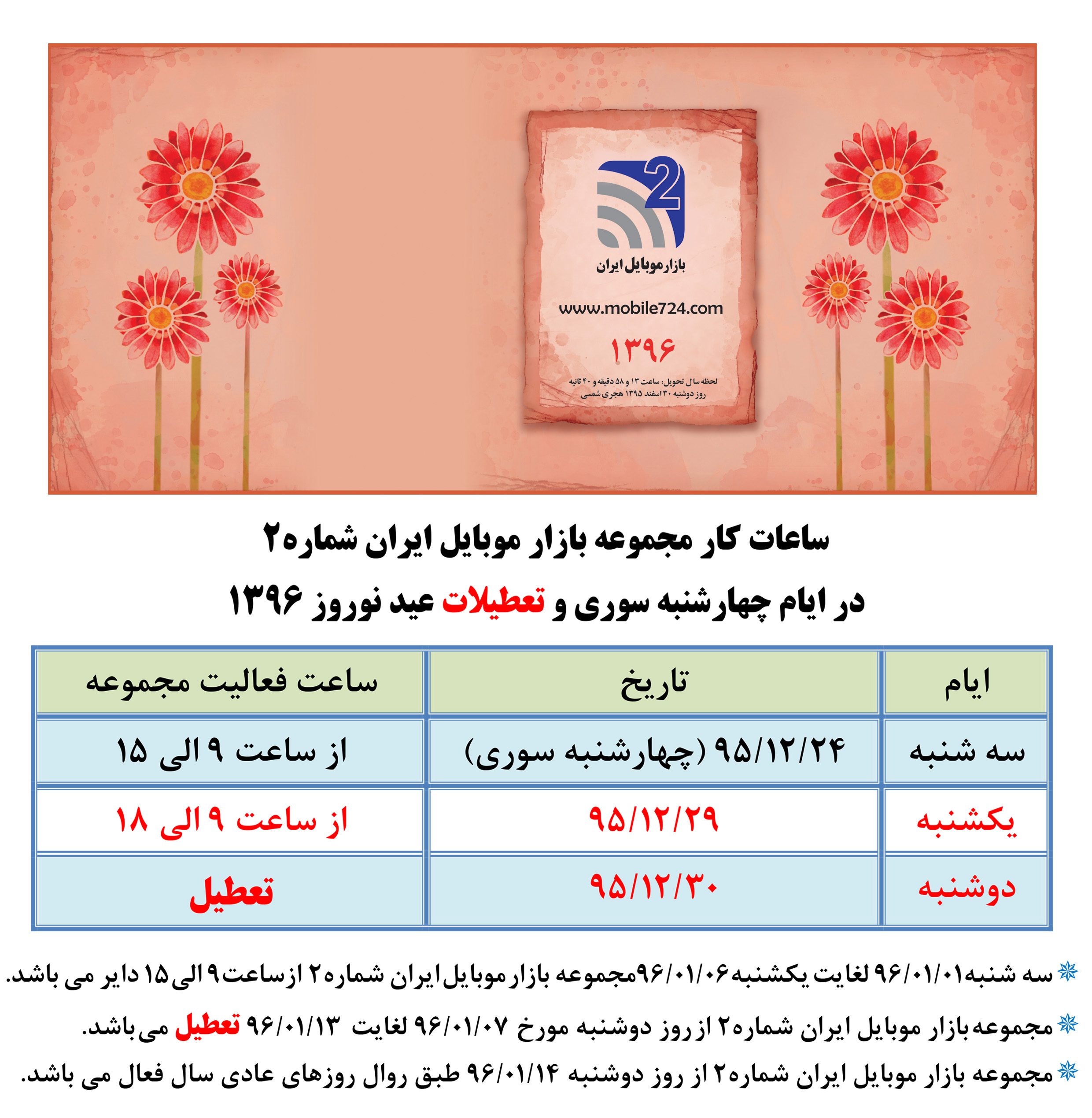 ساعت کار مجموعه بازار موبایل ایران شماره 2 در ایام نوروز 1396 دوشنبه, 25 آذر 1404 برای حمایت از محتوایی که میپسندید، به اشتراک بگذارید: