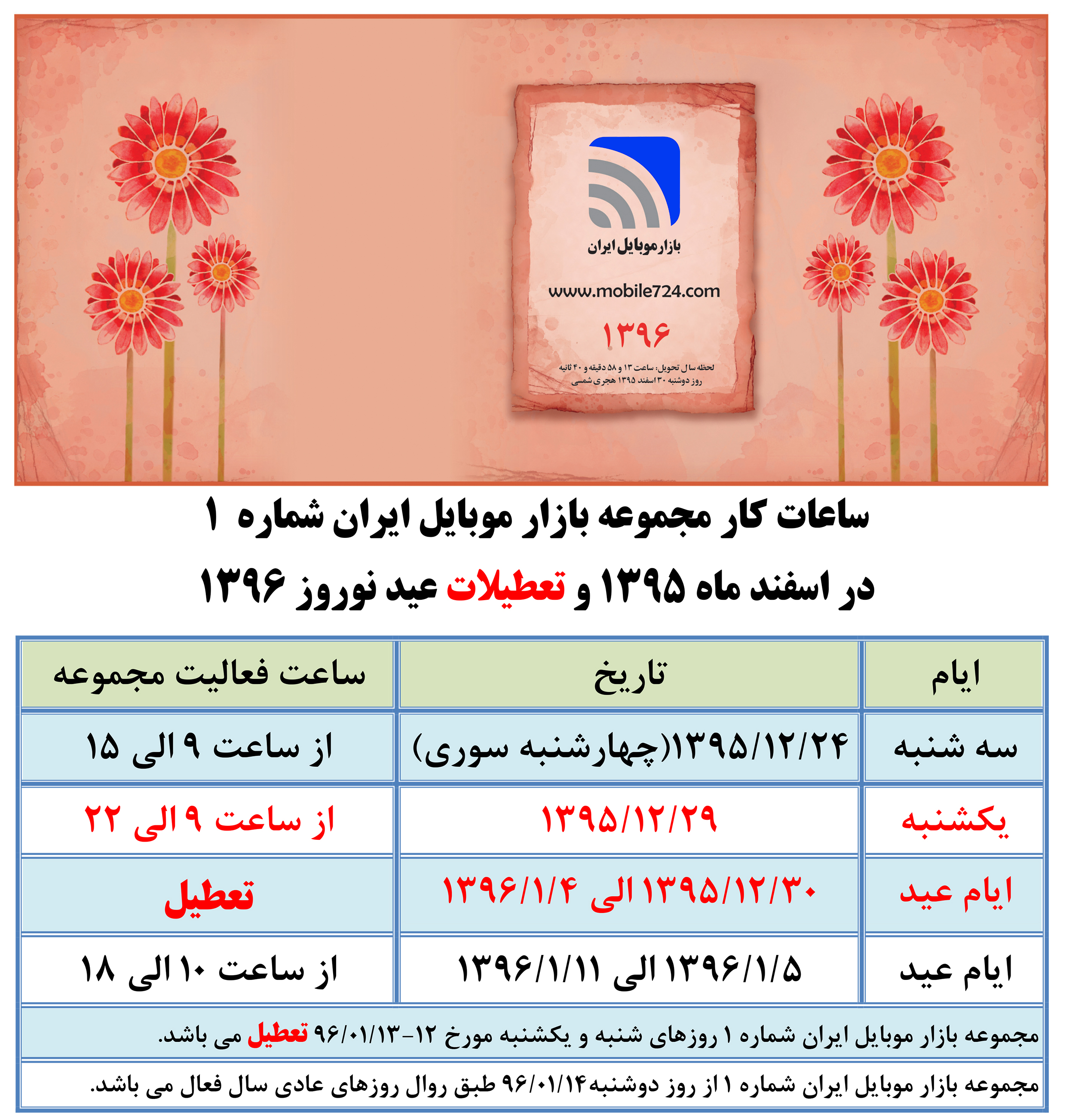 ساعت کار مجموعه بازار موبایل ایران شماره 1 در ایام نوروز 1396 دوشنبه, 25 آذر 1404 برای حمایت از محتوایی که میپسندید، به اشتراک بگذارید:
